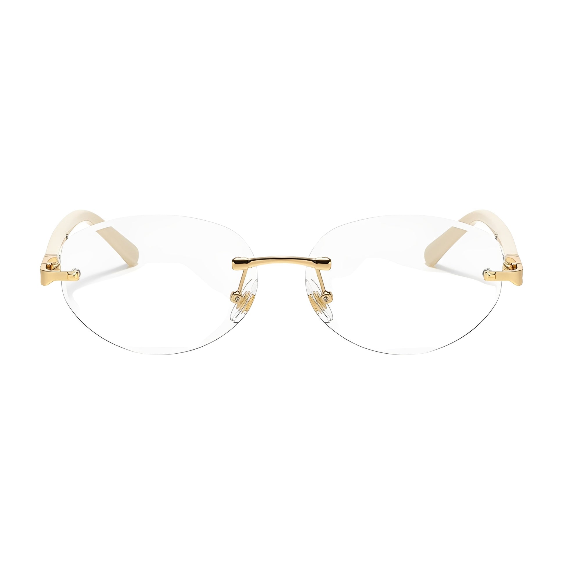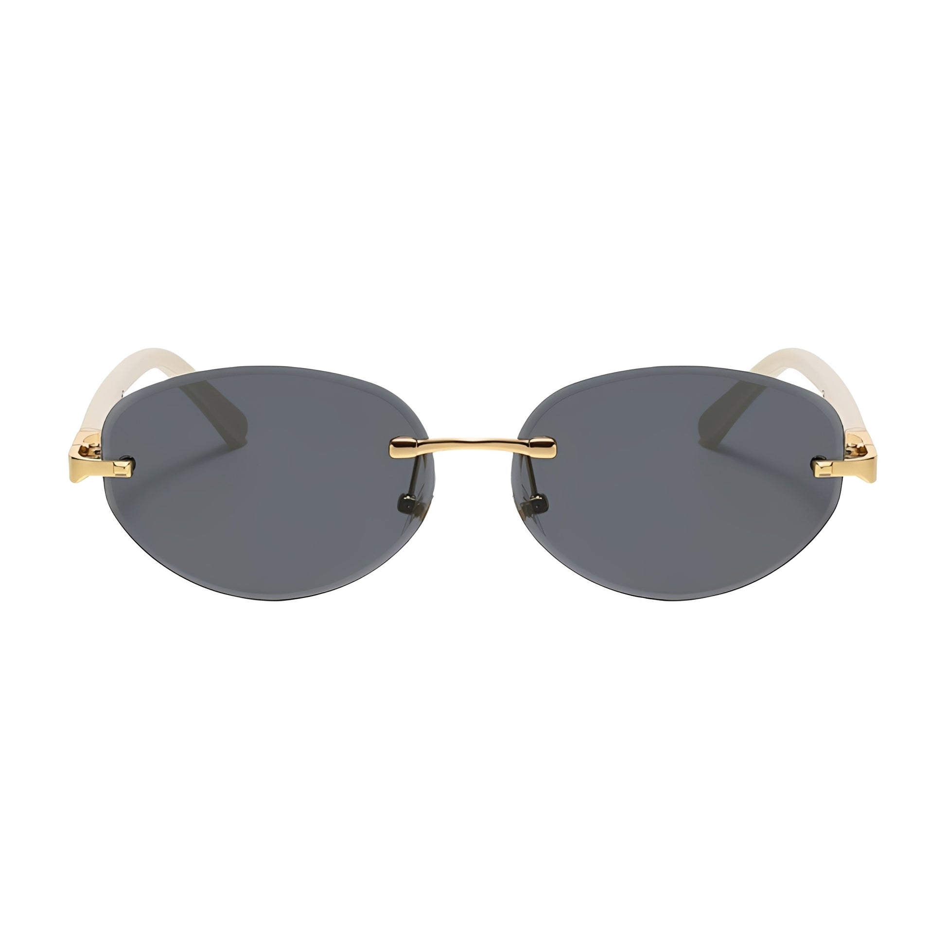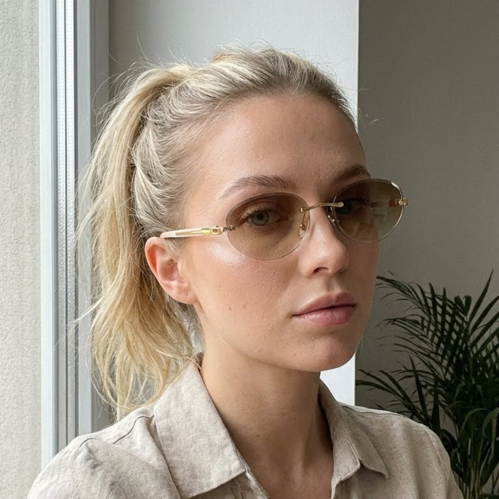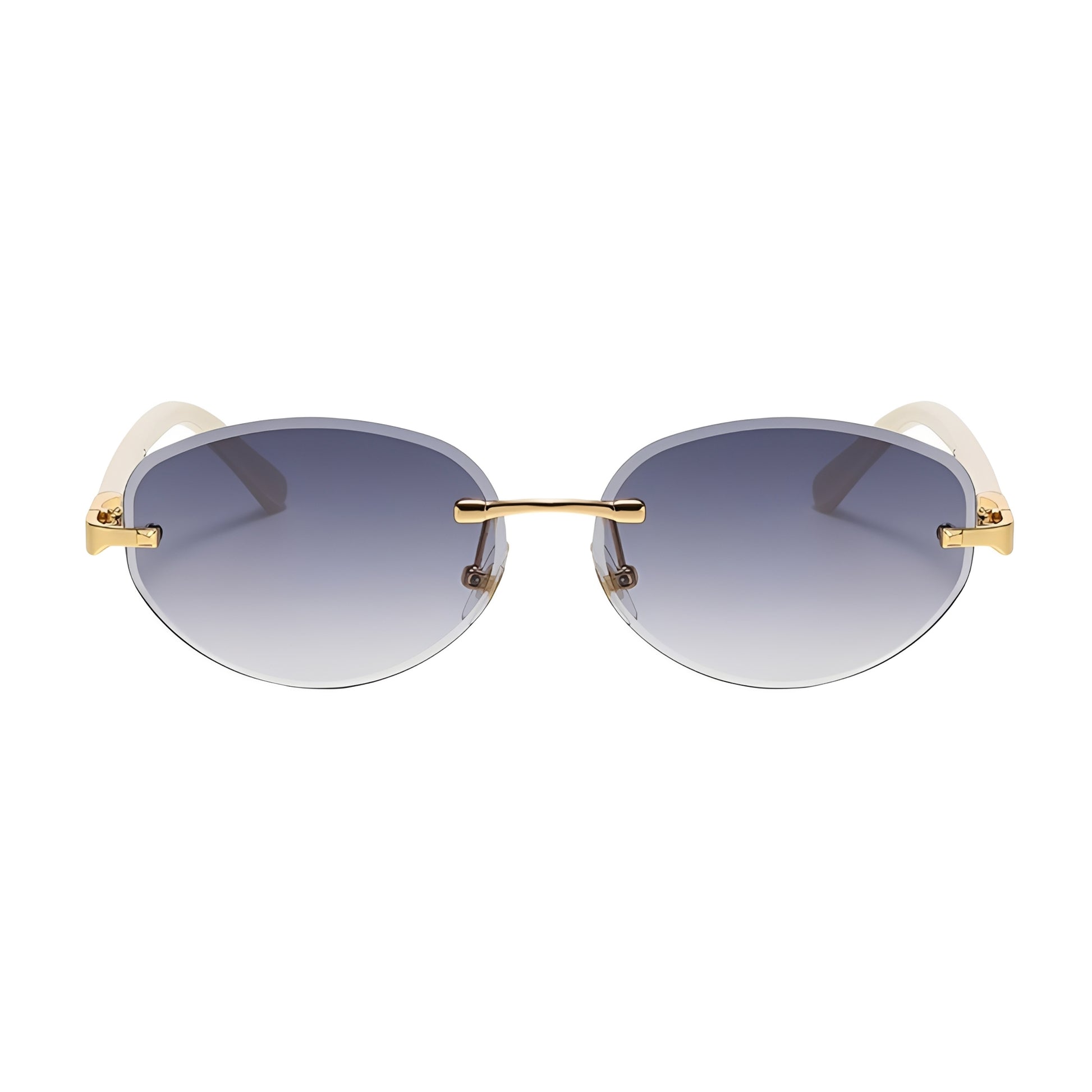 A frameless round silhouette with bold geometric influence, delivering a distinctive, fashion-forward aesthetic.